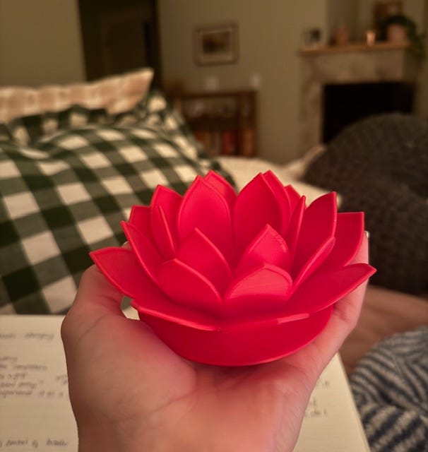 So I watched, through the glass window, the machine whir as the lotus emerged, one thin red layer at a time. It was still warm when K. placed it in my palms, and together, we marveled at how something can move from an idea into shape and form in just four hours time.